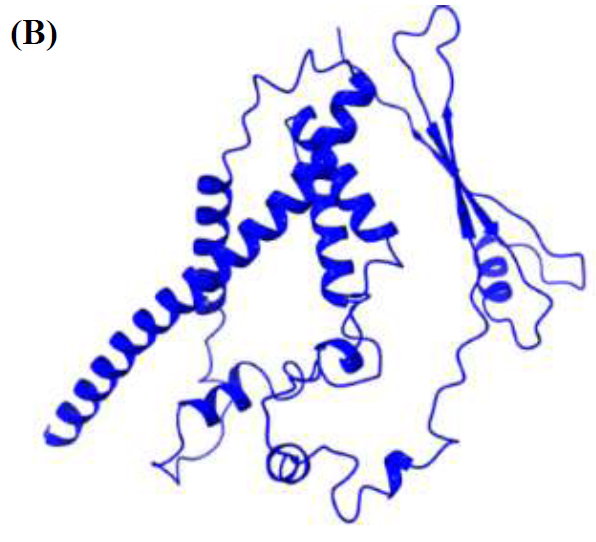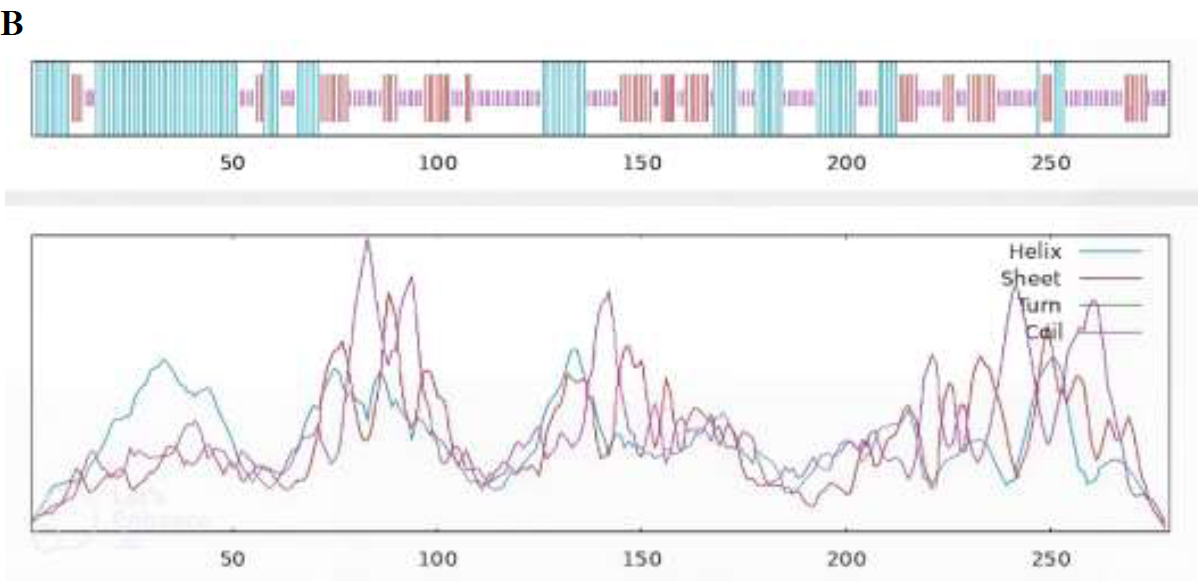 The 2D structures predicted using PsiPred [48] and SOPMA is shown in Fig. (4A and B). SOPMA revealed 40.50% coiled loops, 25.45% β sheets, and 34% α helices.