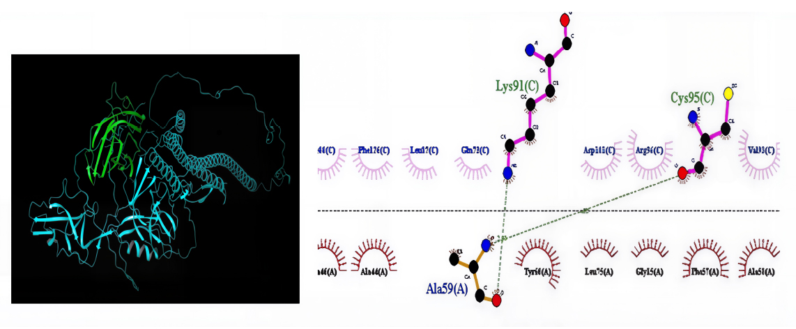 Protein-protein docking was used to determine the stability of the vaccine candidate PKFDVac-I protein receptor complex. The Schrödinger server displayed 30 distinct binding mode poses. On investigating the binding affinity of the vaccine-receptor complex, the top pose with a minimum binding free energy score of -579.716, and Piper energy was -1150.78 was selected. Scores are derived from potential energy changes that occur when proteins and ligands come together. Therefore, a strong binding is indicated by a very negative score, whereas a weak or non-existent binding is indicated by a less negative or even positive score [74]. The complex was then examined through binding interaction residues. The two hydrogen bonds were formed between the Lys91 and Cys95 amino acid residues with the Ala59 residue of the receptor protein, and are represented in Table 10 and Fig. (7). Although only two hydrogen bonds were explicitly identified in the docked PKFDVac-I–TLR-4 complex, numerous non-bonded contacts (hydrophobic packing and van der Waals interactions) and electrostatic complementarity underpin the interface stability, aligning with the highly favorable docking energy. There are no salt bridges formed between two oppositely charged residues, and also no disulfide bonds formed between two cysteine residues. These interactions contribute to the vaccine candidate’s stability by conformational holding of the protein. There was a total of 387 nonbonded contacts that were formed.