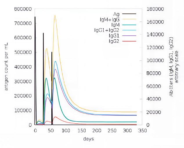 Immune response developed against PKFDVac-I and the levels of immunoglobulins for the antigen concentration using the C-ImmSim server.