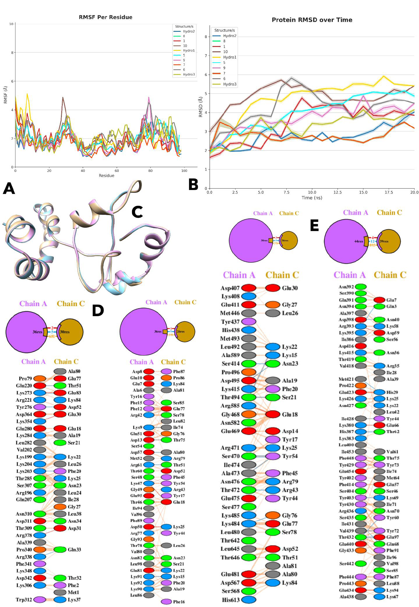 The flexibility between Hydro 2 and Hydro 3 is also compared, highlighting the overall rigidity of Hydro 2. Hydro 2 is noted to have lower values of RMSF, usually ranging between 1 A and 2 A, implying that there are minimal fluctuations and the structure is more stable. However, the Hydro 3 values of RMSF are 0.8 to 3.5 A, which is more dynamic. The greatest variation occurs in structure 10, where there is a maximum RMSF of about 5 A around residue 25, such that this area is the most flexible in all the analyzed structures. These differences in flexibility and rigidity point to the difference in structural behaviors with Hydro 2, Hydro 3, and structure 7 becoming the most stable, which were shortlisted as structural protein-protein docking with HSP90. These three structures are visualized as superimposed structures in Fig. (2C).