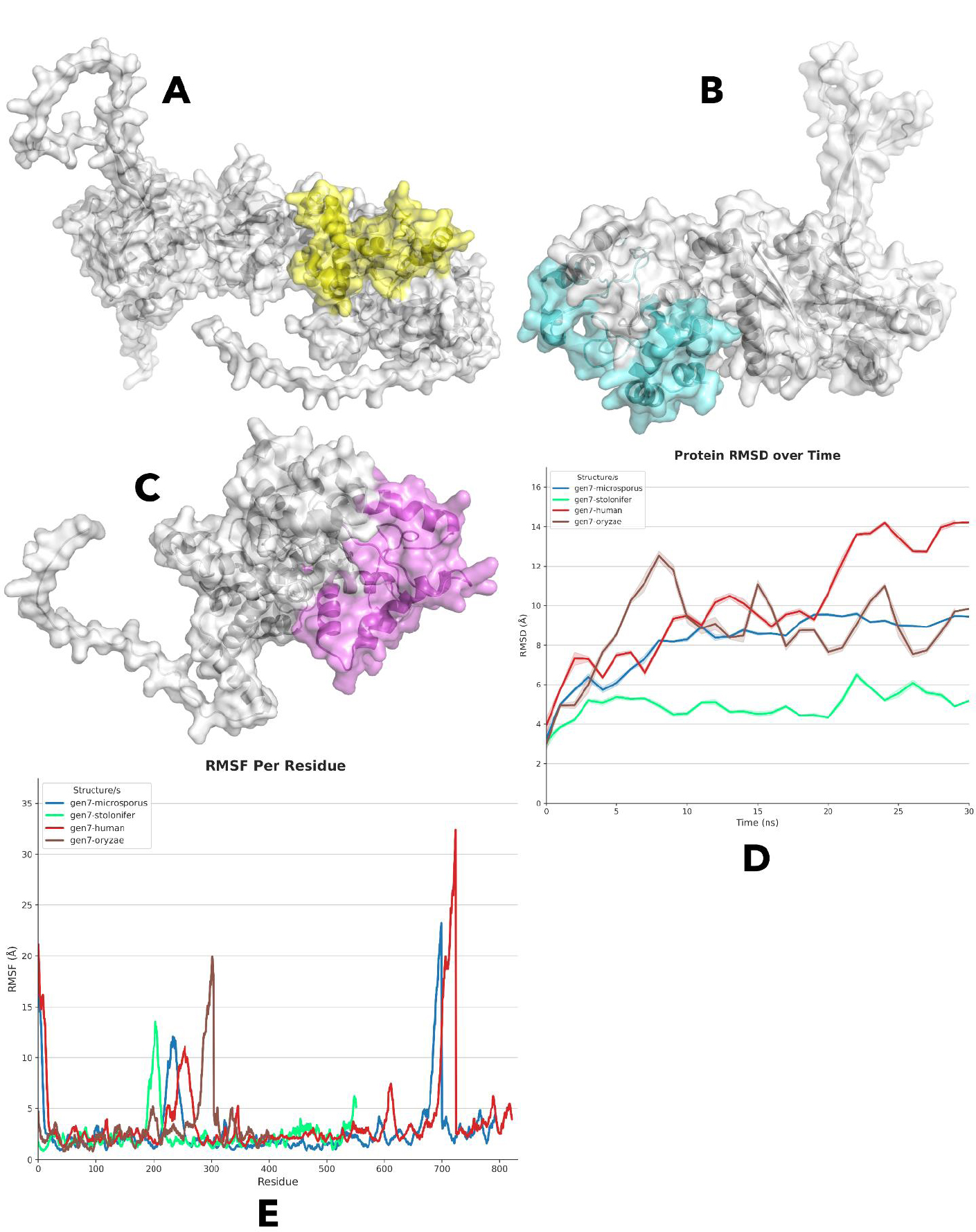 RMSF analysis reveals distinct fluctuations across the structures of gen7 variants. Both gen7-human and gen7-microsporous exhibit relatively high RMSF values (~20 Å) at the starting residues, whereas gen7-stolonifer and gen7-oryzae display lower values (~5 Å) in the same region. All structures remain stable up to residue 200, with gen7-stolonifer showing a spike up to 14 Å, while gen7-oryzae has the smallest peak (~5 Å) among the variants. Around residue 225, gen7-microsporous shows a notable peak, and gen7-human has several smaller peaks in this region. Gen7-oryzae displays the largest peak (~20 Å) at residue 300. After this, the structures generally remain stable, though gen7-human and gen7-microsporous experience high RMSF peaks (~32 Å and ~23 Å, respectively) at residues 700 and 690, before returning to stable values around 5 Å, as given in Fig. (3E).