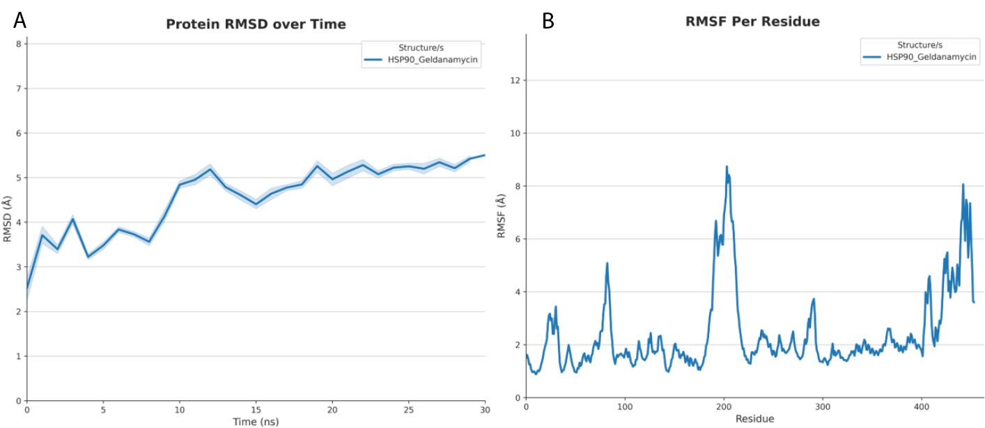 (A) RMSD analysis of the HSP90-Geldanamycin complex over time.