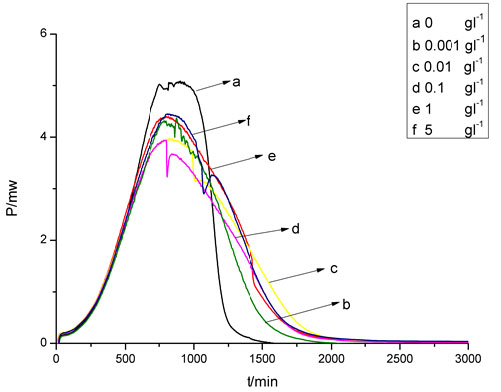 The BMIMCl inhibits yeast growth and has a negative effect on ethanol production [7, 8]. Under different fermentation conditions, the BMIMCl has a different influencing degree on the ethanol fermentation process [7, 8]. In order to have a correct understanding on microcalorimetric data, the ethanol fermentation was carried out under the same conditions as the microcalorimetric measurement in this work. The time courses of yeast growth, ethanol production and the fermentable sugars consumption at different BMIMCl concentrations for ethanol fermentation process are shown in Fig. (1). As shown in Fig. (1), the ethanol fermentation had the characteristics of the typical batch fermentation process at all BMIMCl concentrations. The yeast growth during ethanol fermentation process consisted of four different periods: the lag phase, the log growth phase, the late log growth phase, and the stationary phase. Compared with the control, the lag and log growth phase cost almost the same time at all BMIMCl concentrations, but the time of the late log growth phase and the integral fermentation time were extended with increase of BMIMCl concentration. When the BMIMCl concentration was 0, 0.001, 0.01 and 1 gL-1, the yeast reached its highest concentration at 21, 27, 30, 33 and 36 h, and the produced ethanol arrived at its highest concentration at 27, 30, 33, 36 and 39 h respectively. When the BMIMCl concentration was 5 gL-1, the yeast and ethanol concentration was slowly increased at 42 h. Table 1 lists some important ethanol fermentation process data at different BMIMCl concentrations. As indicated in Table 1, when the BMIMCl concentration increased from 0 to 1 gL-1, the final yeast and ethanol concentration, the ethanol yield from the fermentable sugars (Yp/s) and the maximum yeast specific growth rate (µm) all decreased, but the final fermentable sugars concentration and the average specific ethanol productivity of yeast (E) was slightly increased. All these results suggest that the negative effect of BMIMCl on ethanol production came from its inhibition on yeast growth. This is consistent with our previous studies [7, 8]. From Fig. (1) and Table 1, it is also found that the BMIMCl severely inhibited yeast growth and ethanol formation when its concentration reached 5 gL-1. Its final yeast and ethanol concentration was much lower than that when the BMIMCl concentration was 1 gL-1. It implies that high BMIMC1 concentrations may cause a change in the yeast metabolism. This is consistent with the previous studies that ionic liquids could shift yeast metabolism from respiration to fermentation and damage mitochondrial function by inducing hyperpolarization of the mitochondrial membrane [10, 11].