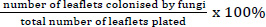 The leaflets were surface-disinfected by immersion in 70% (v/v) ethanol for 60 seconds and then rinsed in distilled sterile water (dsH2O) for 60 seconds, a modification [15, 16]. The leaflets were subsequently plated on Potato Dextrose Agar (PDA; Merck-Biolab, Gauteng, South Africa), five leaflets per plate, totalling 100 PDA plates. The plates were incubated at room temperature until visible growth occurred. The colonization frequency was then determined using the following formula (1) [16]: