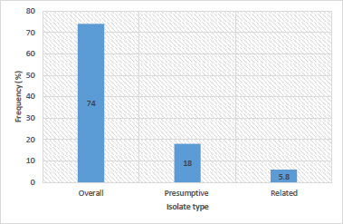 Colonisation frequencies of the isolates. The numbers within the bars represent the frequency percentages.