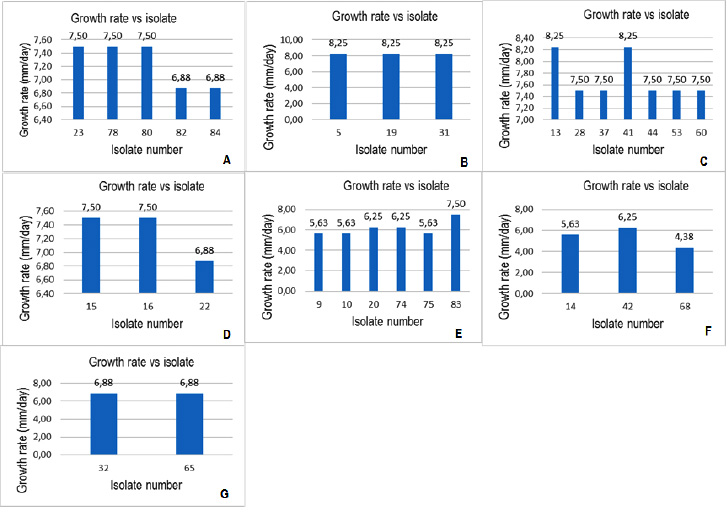 Fig. (3A-G) below presents a graphical representation of the growth rates of the investigated isolates. The growth rates were determined on day seven. Isolates with growth rates between 0 and 2.75 mm/day were classified as slow-growing fungi, growth rates between 2.76 and 5.51 mm/day and 5.52 and 8.25 mm/day were categorized as moderate and fast-growing fungi, respectively. Subsequently, based on the aforementioned criterion, all isolates were fast-growing except isolate 68, which had a moderate growth rate. Since Botryosphaeriaceae species are fast-growing species [16], the isolates, except isolate 68, fit another trait as presumptive isolates.