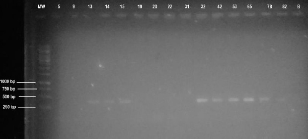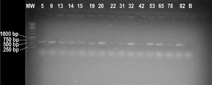 Visual presentation of the BOT amplicons of the isolates. MW represents a molecular marker, and the rest of the numbers on top represent the lanes in which the respective isolate amplicon was loaded. Lane B corresponds to a blank. The numbers on the left show the size of the bands where the lines are pointed.