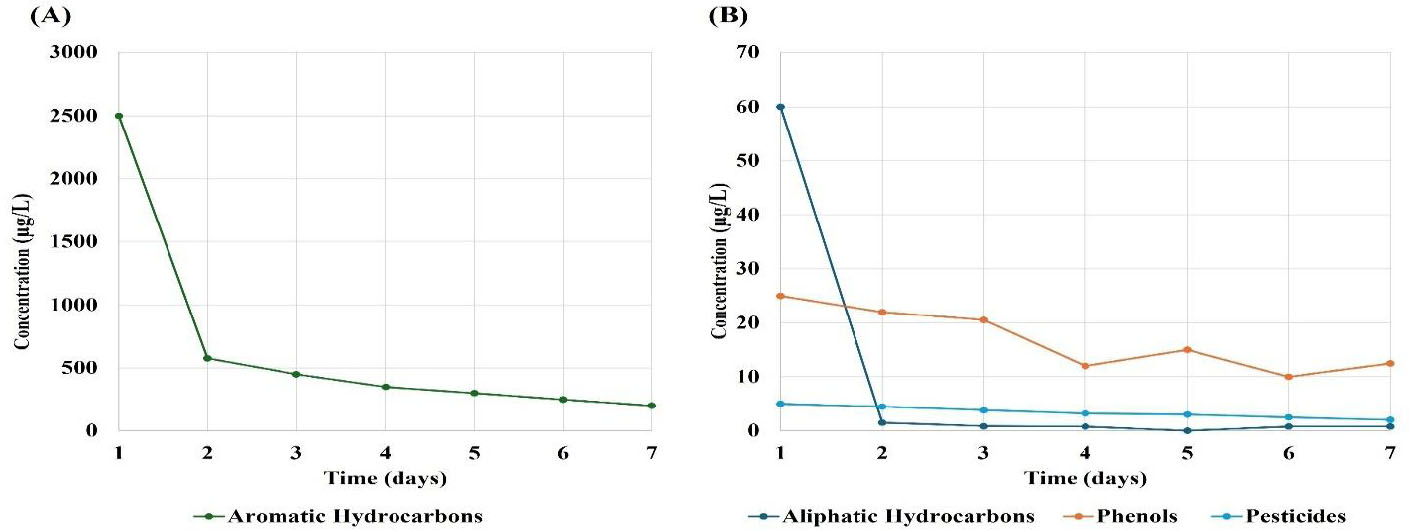 Figure 2 presents the changes in concentrations of organic contaminants in treated water from the Hammar marshes (site 2), showing a rapid decrease in pollution levels. Figure 2A demonstrates that aromatic hydrocarbon concentrations decreased from 2500 to 200 µg/L, indicating a 92% reduction. Figure 2B demonstrates the changes in concentrations of aliphatic hydrocarbons, phenols, and pesticides. The concentration of aliphatic hydrocarbons decreased significantly from 60 µg/L on day 1 to 0.1 µg/L on day 7, indicating a nearly complete elimination of these compounds. This rapid decrease suggested aliphatic hydrocarbons to be highly susceptible to degradation or removal processes. Phenol concentrations decreased from 25 to 12.5 µg/L over the study period, indicating a 50% reduction. However, a slight increase was observed on day 7, suggesting a variability in degradation rates or environmental conditions. Pesticide concentrations decreased from 5 to 2 µg/L over the study period, indicating a 60% reduction. This consistent decrease indicated that pesticides can be effectively removed or degraded.