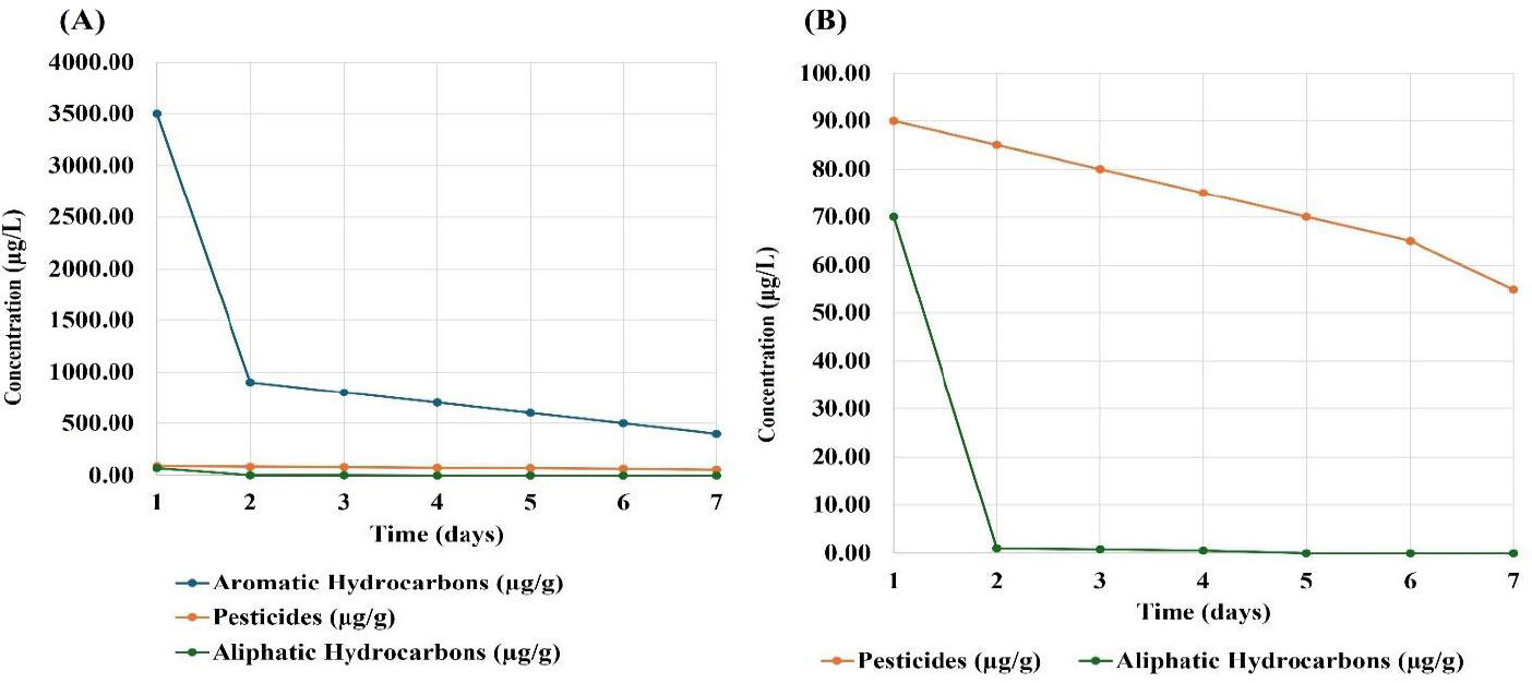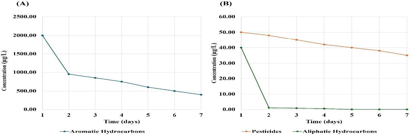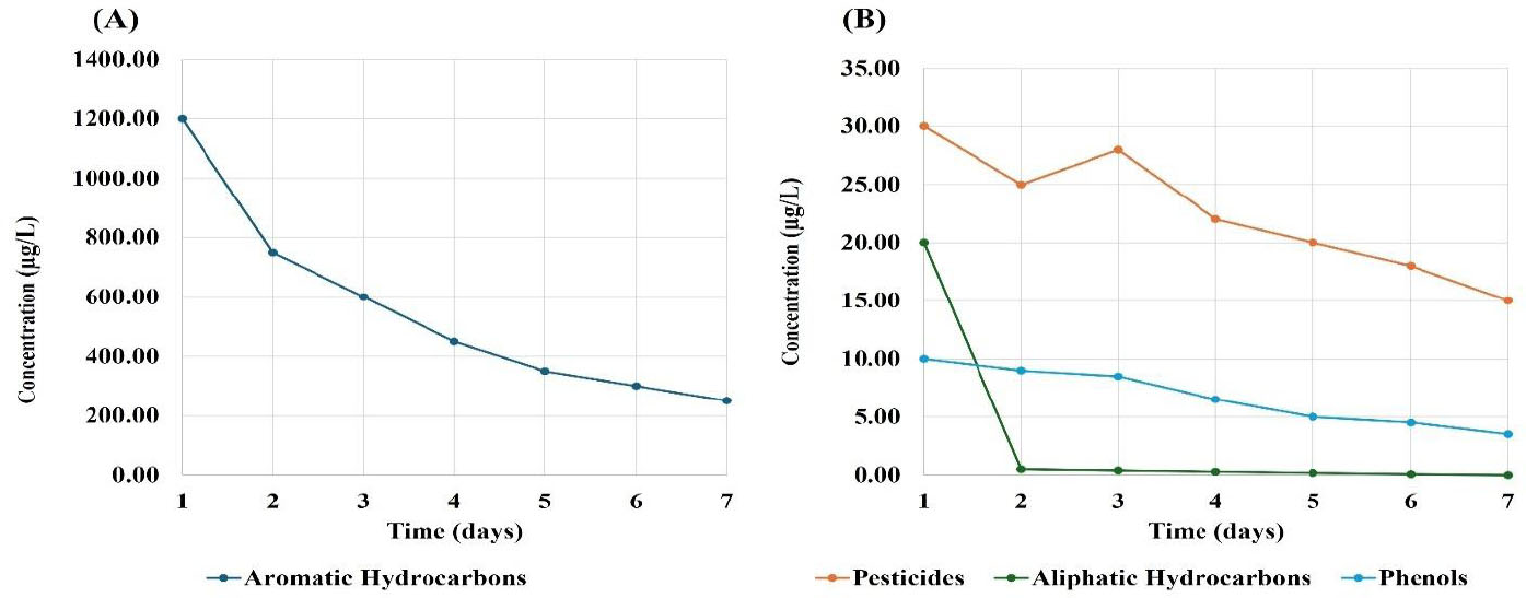 Changes in concentrations of the organic contaminants found in the treated water from the Northern Hawizeh marshes (site 5). The x-axis represents time (days), and the y-axis represents contaminant concentration (µg/L). (A) Aromatic hydrocarbons; (B) aliphatic hydrocarbons and pesticides.
