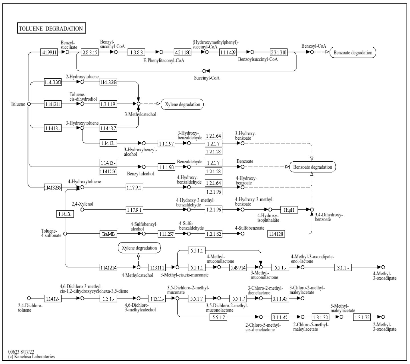 Degradation pathways of organic compounds in Pseudomonas with key genes.