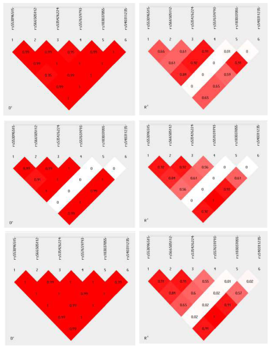 The allele frequencies of the present study are clarified in Table 3. No statistically significant associations were observed across all SNP alleles; slight differences in SNP allele frequencies were observed between study groups.